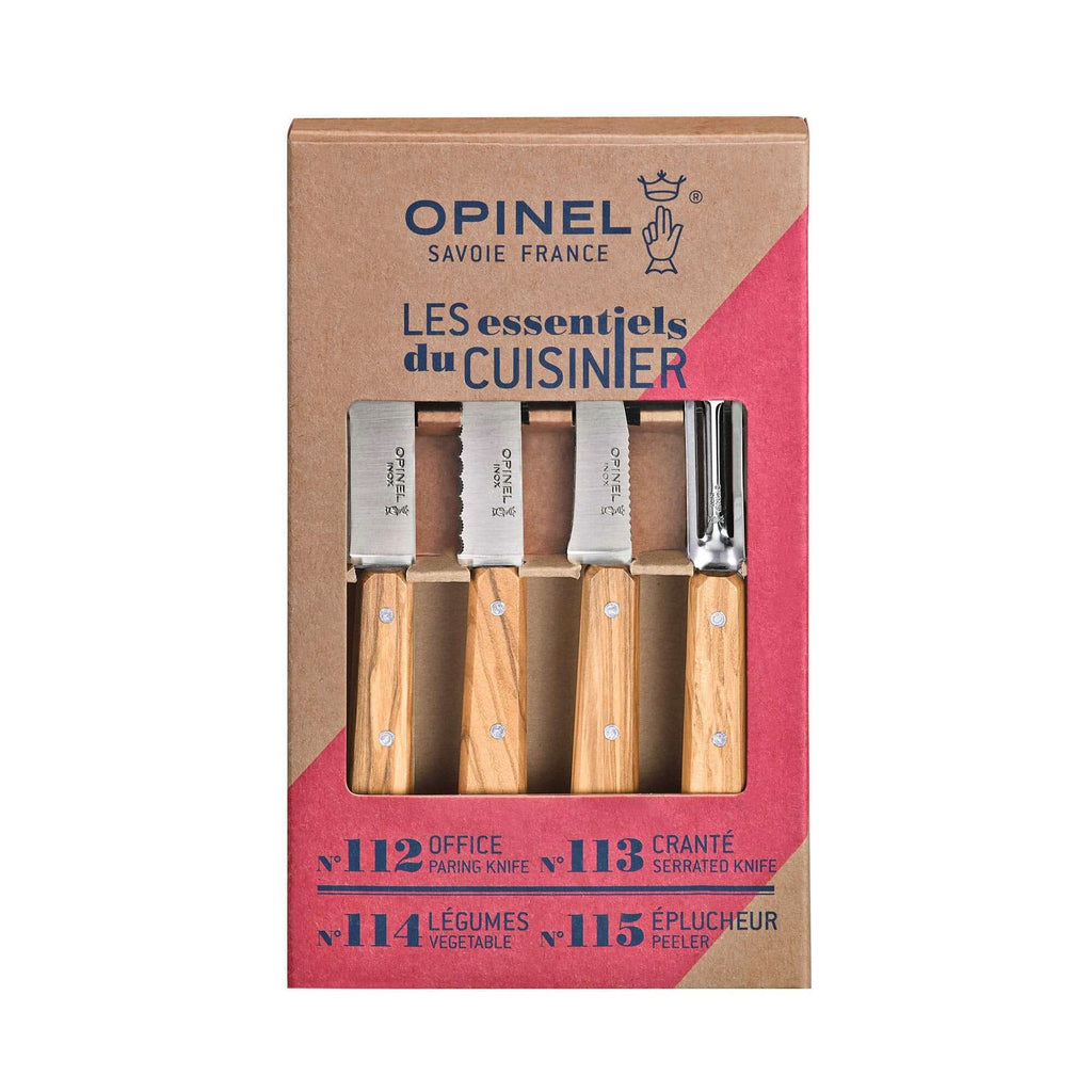 Das Opinel Essentials Küchenmesser-Set vereint vier vielseitige Küchenhelfer in einem Set. Die Messer sind mit scharfen Klingen aus rostfreiem Sandvik-Stahl ausgestattet und liegen dank der edlen Olivenholzgriffe angenehm in der Hand.