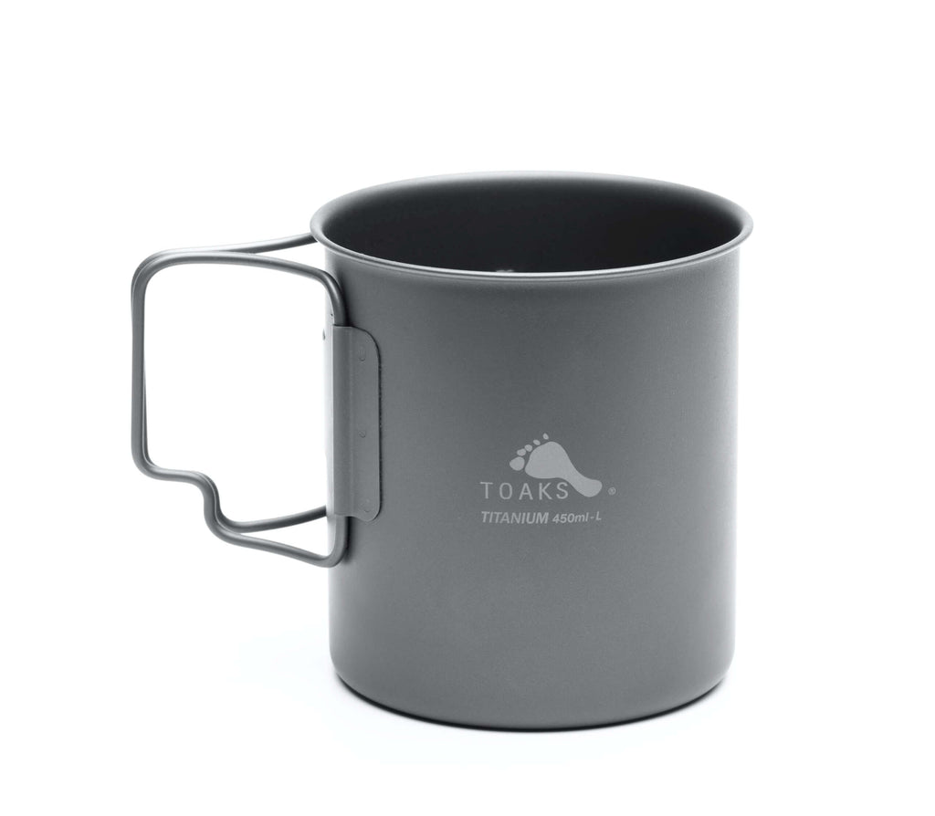 Die TOAKS 450 ml Titan-Tasse wiegt nur ca. 70 g – perfekt für ultraleichte Ausrüstung.